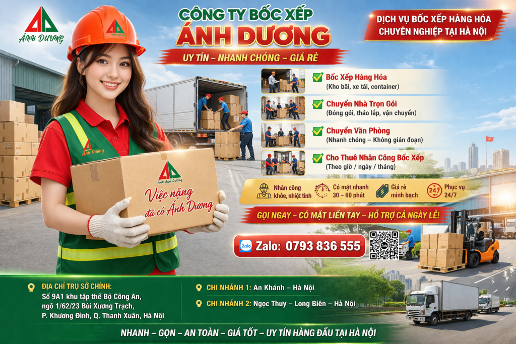 Công ty bốc xếp Ánh Dương cung cấp giải pháp nâng hạ máy móc nặng, bốc xếp hàng hóa an toàn tại Hà Nội. Đội ngũ có chứng chỉ vận hành, thiết bị hiện đại, bảo hiểm hàng hóa 100%. Hotline: 0383.333.313